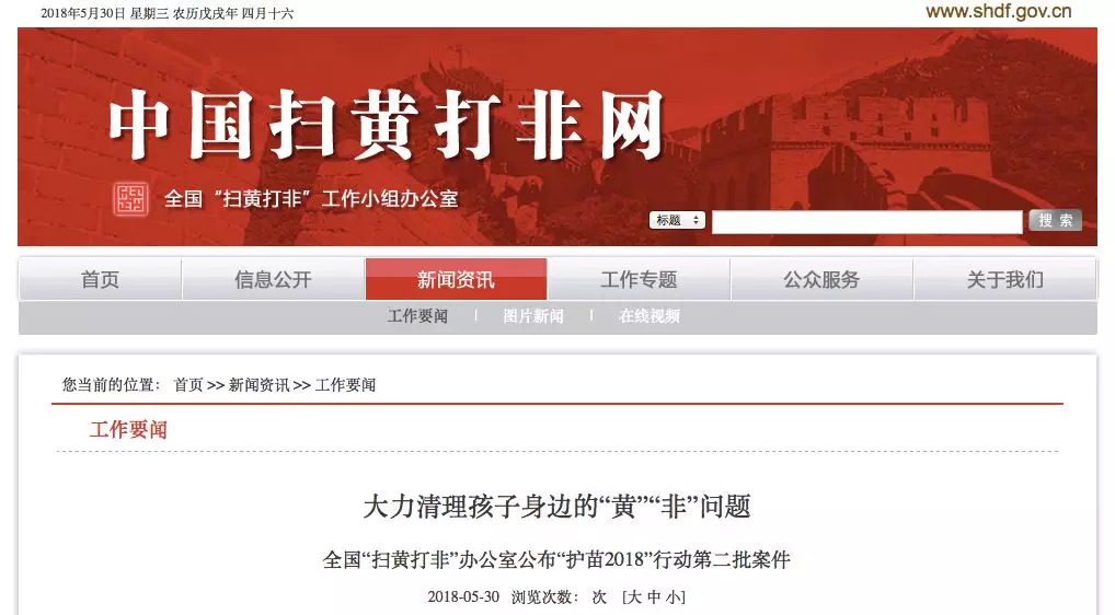 5月30日,全国扫黄打非办公室公布“护苗 2018 ”行动第二批案件。