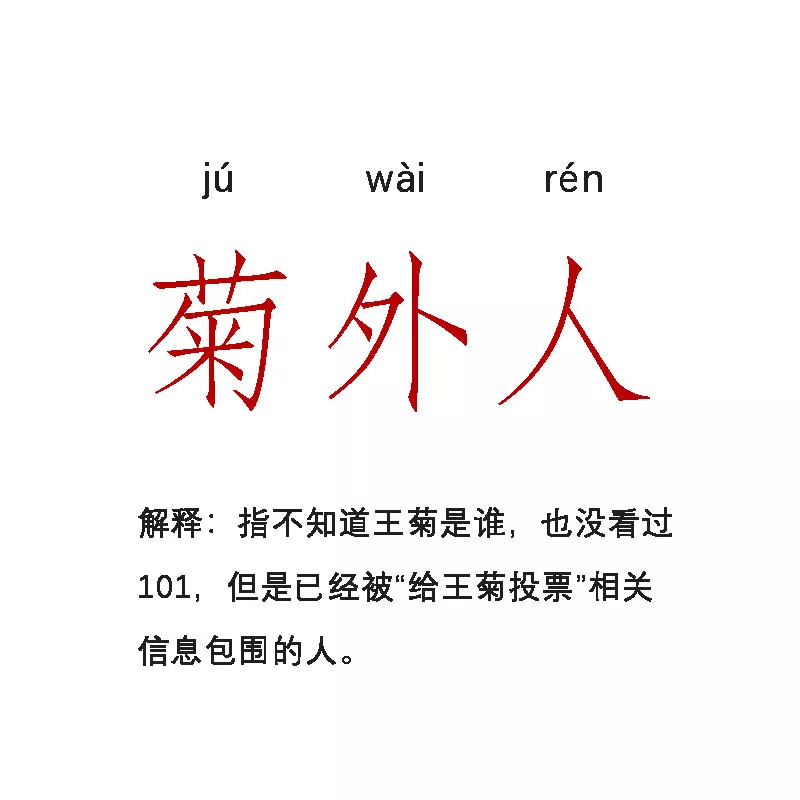 答:看了节目给王菊单纯投票的叫“菊内人”,没看节目受到安利的叫“菊外人”,粉丝叫“陶渊明”。我属于“菊内人”。