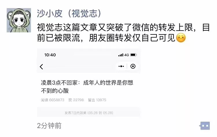 重点是在临近中午11点的时候,视觉志CEO沙小皮发了一条朋友圈,称“这篇文章又突破了微信的转发上线,目前已被限流,朋友圈转发仅自己可见。”还附上了一个这篇文章的后台阅读量数据。截图显示,截至10点40分,阅读量665万+。
