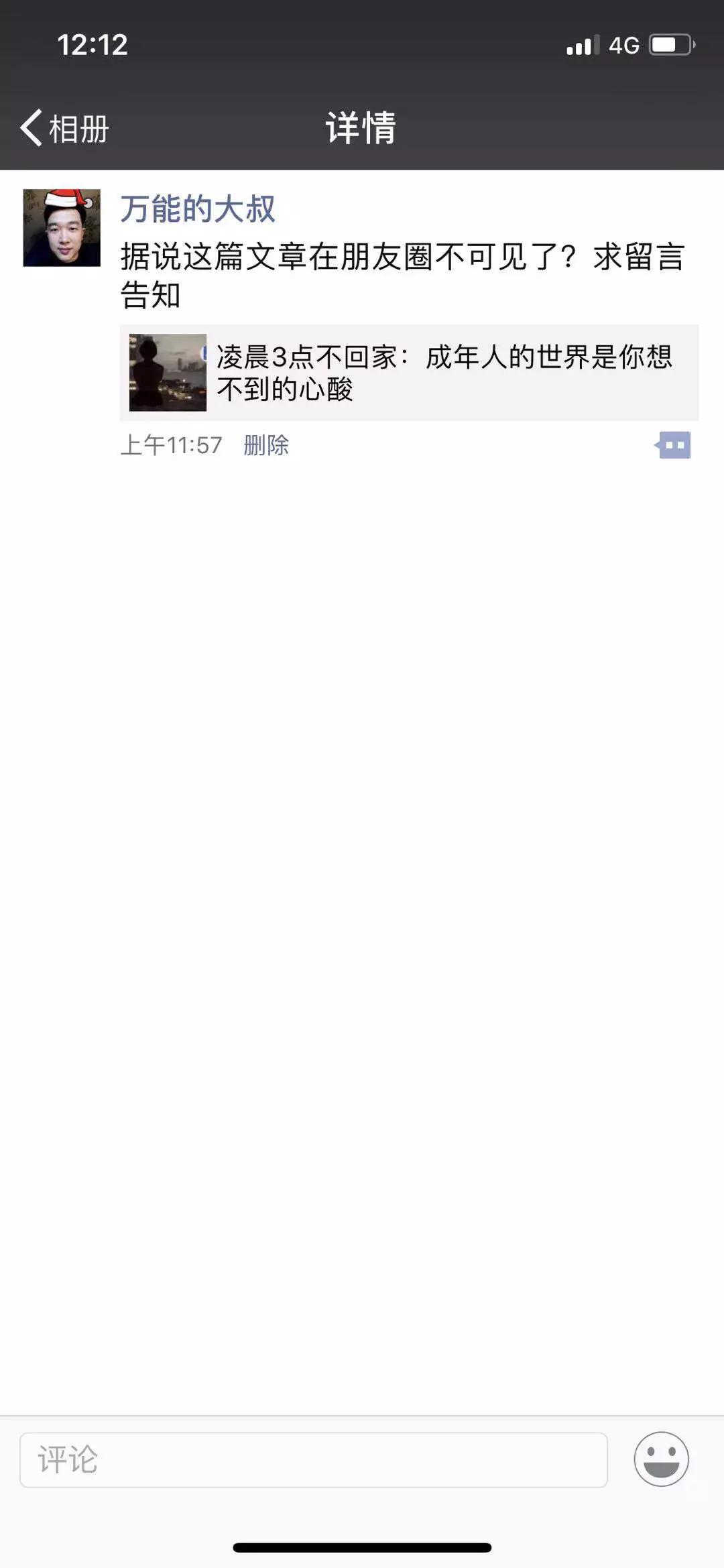 随后,大叔让团队的小伙伴测试了一下,11点17分,分享到朋友圈这篇文章,仍然可见,有用户留言和点赞。据说在11点30分,都能看到朋友圈有人在转发这篇文章,大叔本人亲自在11点11点57分测试,这条朋友圈动态确实变成了仅自己可见。虽然晚了近1个小时,但还是证实了沙小皮的“被限流”说法。