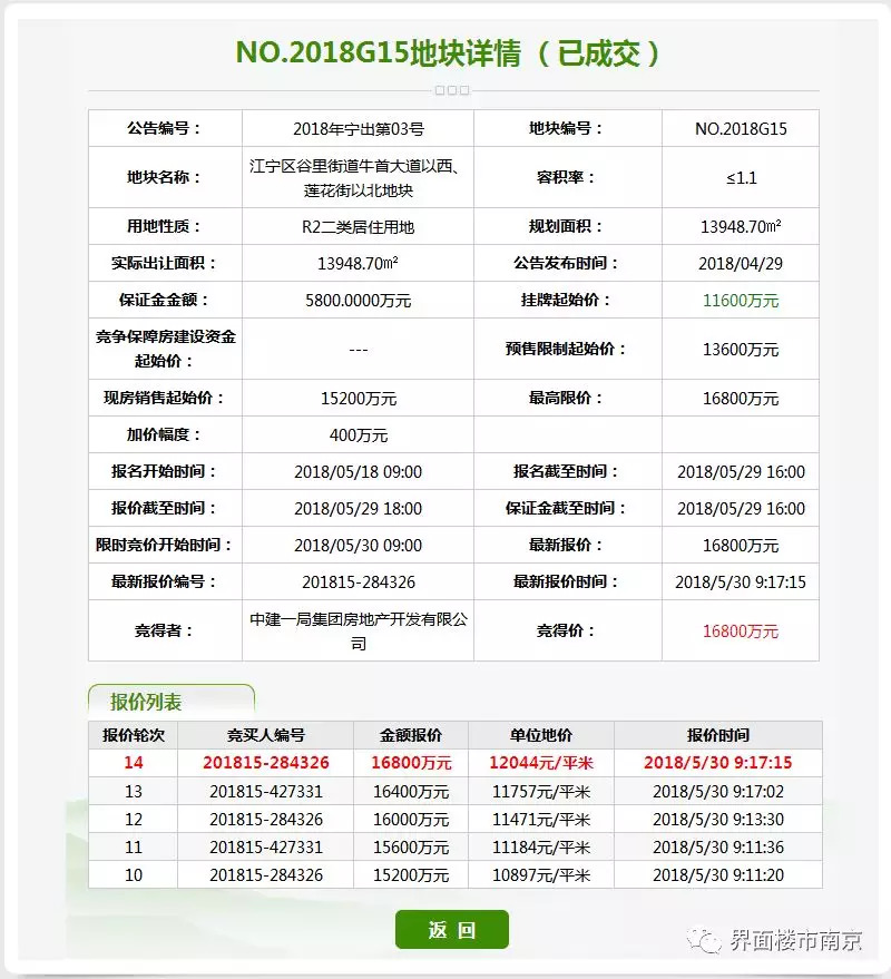 1、江宁G15地块,经过14轮竞拍,被中建一局集团房地产开发有限公司以1.68亿元竞得,楼面价10949元/㎡,现房销售。