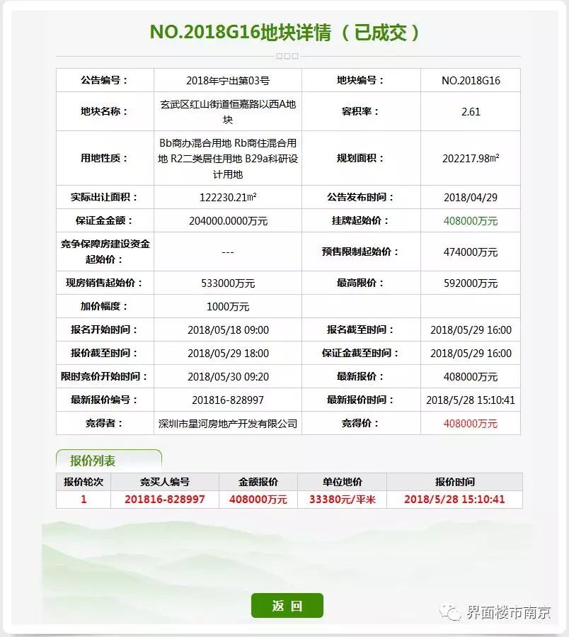 2、新玄武G16地块,经过1轮竞拍,被深圳市星河房地产开发有限公司以底价40.8亿元竞得,楼面价为12789元/㎡。