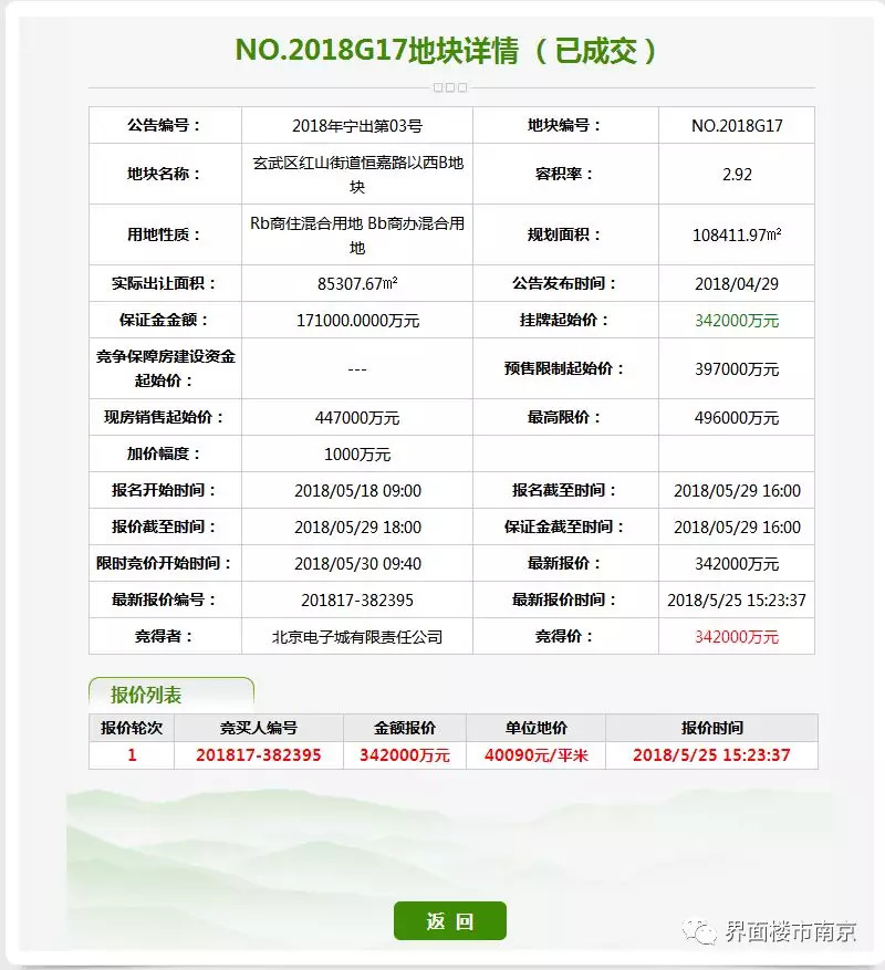 3、新玄武G17地块,经过1轮竞拍,被北京电子城有限责任公司以底价34.2亿元竞得,楼面价为13730元/㎡。
