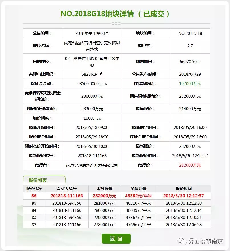4、西善桥G18地块,经过86轮竞拍,被南京金羚房地产开发有限公司以28.2亿元竞得,楼面价为17919元/㎡。