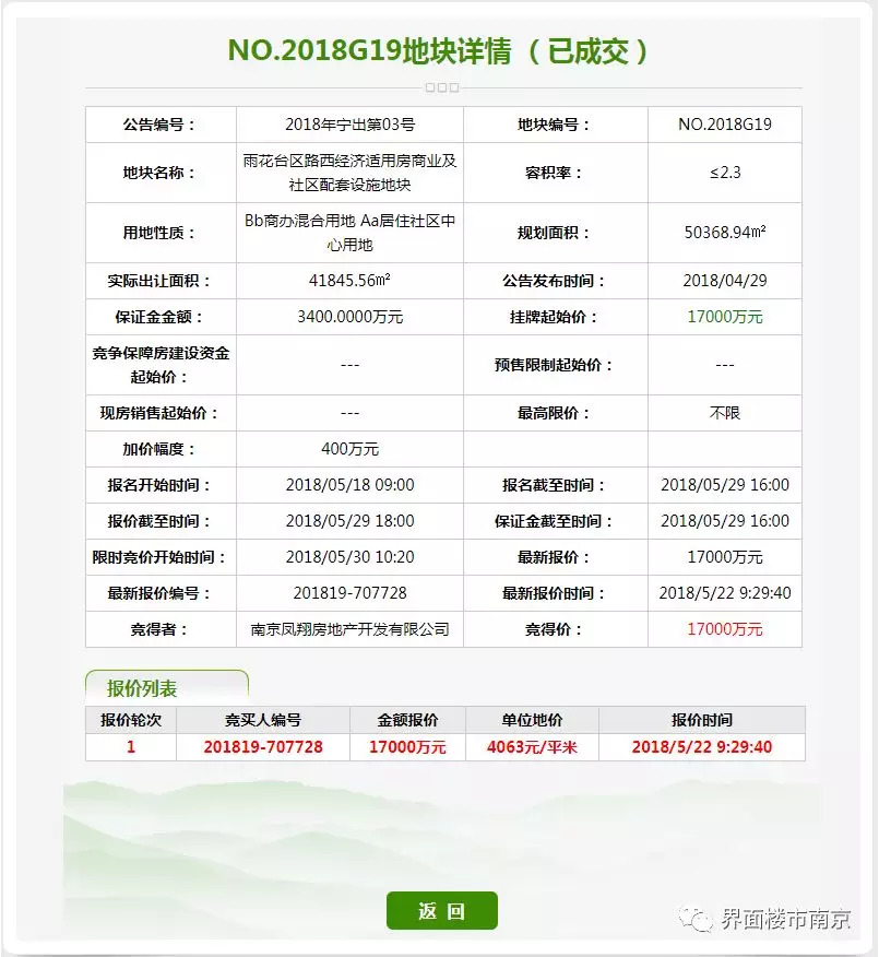 5、板桥G19地块,经过1轮竞拍,被南京凤翔房地产开发有限公司以底价1.7亿元竞得。