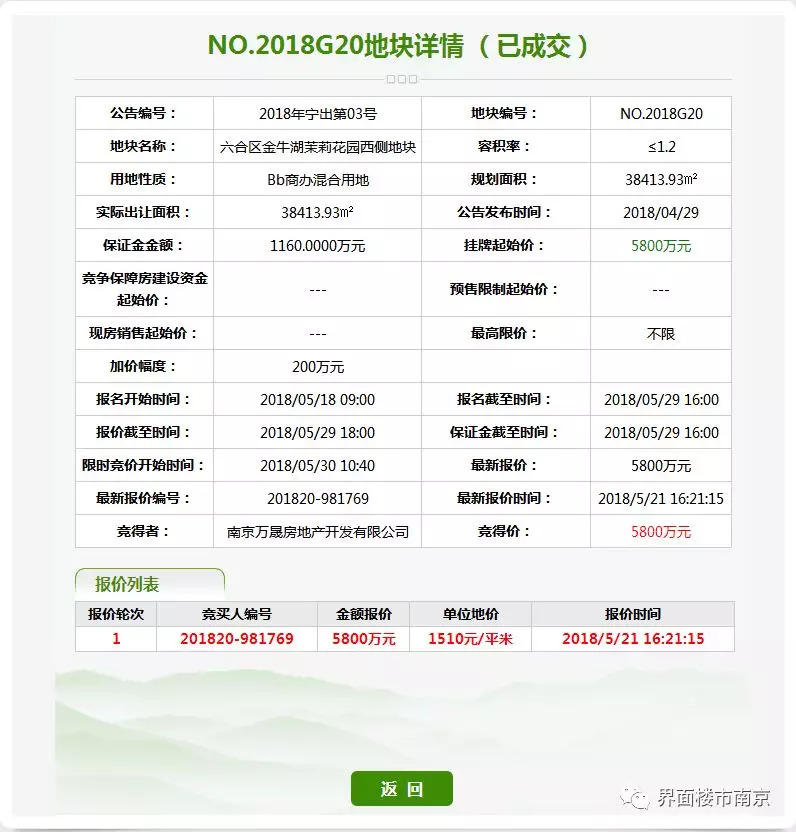 6、六合G20地块,经过1轮竞拍,被南京万晟房地产开发有限公司以底价0.58亿元竞得。