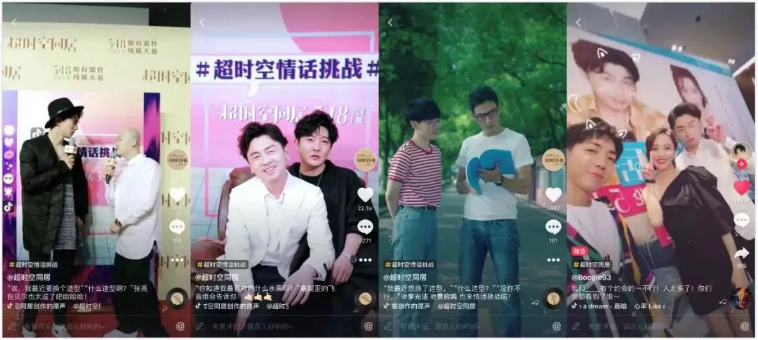 与此前不同的是,《超时空同居》的宣发手段更加切合时代。通过与“抖音”的官方合作,利用明星撬动大盘,最终引导观众。从可以追踪的线索来看,这场合作开始于抖音比正常的点映还要提前1周的超前观影场,发酵于雷佳音与佟丽娅“土味情话”的视频,最终在艺人矩阵的带动之下,爆发成为潮流,带动更多参与者。