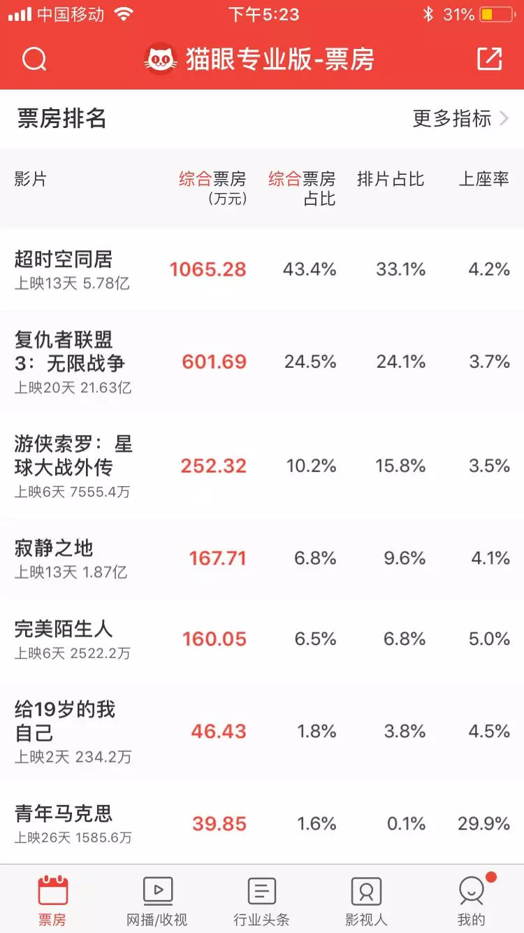 事实上,上映第四天的5月21日,《超时空同居》就以3798万单日票房超过《复仇者联盟3:无限战争》的3156万登顶,将狂欢了半个月的《复联3》挤下了日票房冠军的宝座。截至5月28日,《超时空同居》的单日票房冠军已保持近一周,排片量也增长至32%,与此时的《复联3》平分秋色,而《游侠索罗》守着12%已难有翻身。