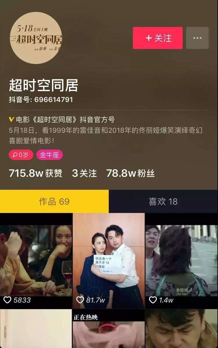 其结果就是一个简单的抖音“土味视频”,吸引了300万点赞、3.5万评论、4.2万分享以及226.5万粉丝。最终,在电影上映前,《超时空同居》的官方抖音号就已经收获了近500万点赞,积累了超过40万粉丝,而在电影上映之后粉丝数更是飙升到78.8万。