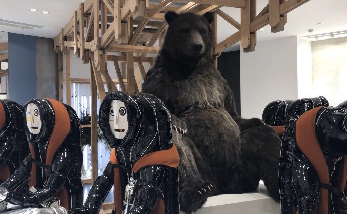 例如在西安SKP这个全球最大旗舰店中,Gentle Monster以“鱼工厂”为主题,讲述了一个关于神奇村庄的故事。店内有鱼、巨大的熊、“村民”、外太空生物和科技感十足的装置,完全不像一家眼镜店。