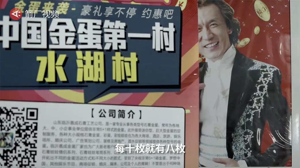 村口有塑钢搭起来的高大拱架,挂着“中国水湖金蛋电商基地”。路边的喷绘广告,非常6+1的舞台前,李咏翘着大拇指,笑出一口白牙,“金蛋来袭,豪礼享不停”。