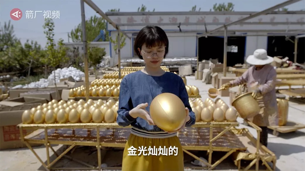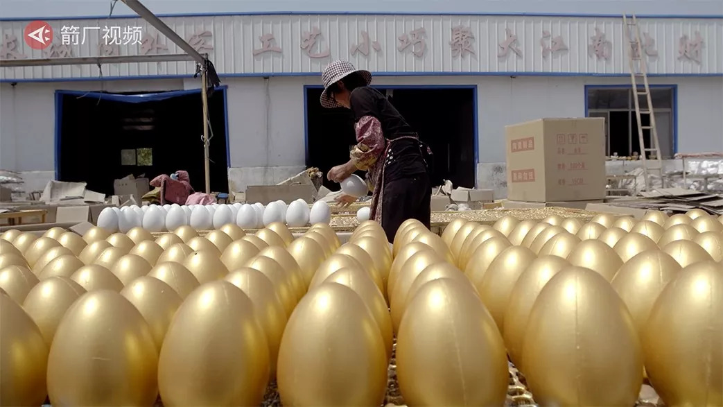这户村民顶着宽沿帽,戴着线手套,正拿水瓢挨个儿往莹滑光亮的白蛋上浇淋金漆。这样的温度下,过不了多久,一片金光灿灿就会占领整个后院,随之而来的是像摘收果实一样,金蛋被利落地装进有瓦楞间格的标准纸箱。