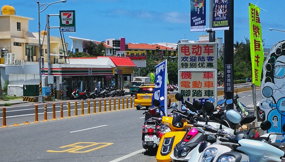 比起台北,垦丁简直热过头了,我坐在旅馆大堂磨蹭到傍晚才肯出门。看了地图才知道,垦丁的景点之间基本上都相距8公里左右,难怪大街上全是租赁机车电动车的摊位,可我不会骑电动车,老板带我去停车场让我试试,启动和转弯都顺利,最后停下的时候出了意外,电动车的油门阻力太小,老板的车又加大过马力,我开始减速,同时伸开手指去抓刹车,带动油门又加了一次速。
