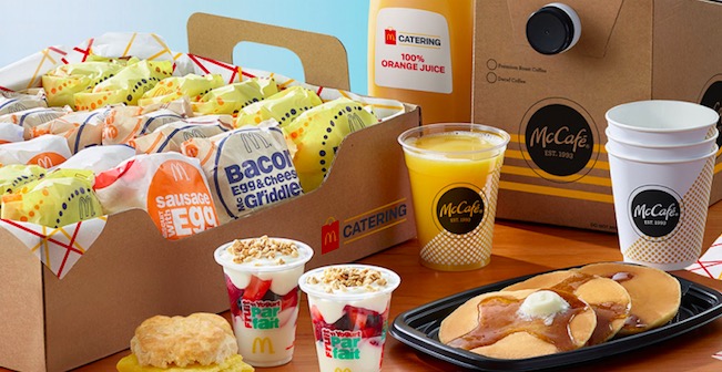 麦当劳最近宣布与UberEat合作,在佛罗里达的195个餐厅测试早晨团体供餐服务,包括松饼、酸奶巴菲、咖啡和麦满分等产品。这一服务主要面向6人以上的办公室、会议等团体订餐的场合,目前仅限早餐时段。这样做的还有唐恩都乐,就在今年3月这家公司开始在美国四个州测试早晨团体供餐。