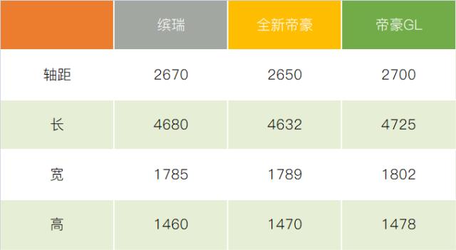 在车身尺寸方面,缤瑞的轴距为2670mm,车身长度4680mm,算是比一般的自主A级车尺寸更大些。对比一下全新帝豪和帝豪GL,缤瑞恰好是居于两款车之间,三款车形成一个完美的梯度上升。同时,这一尺寸很接近合资企业的英朗、朗逸、宝来等产品级别。