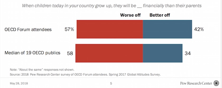 这个比例跟普通民众的看法相差不大:去年,皮尤针对19个OECD国家普通民众的调研结果显示,58%的民众认为,他们本国的下一代经济状况会变糟糕,而认为会变好的比例为34%。