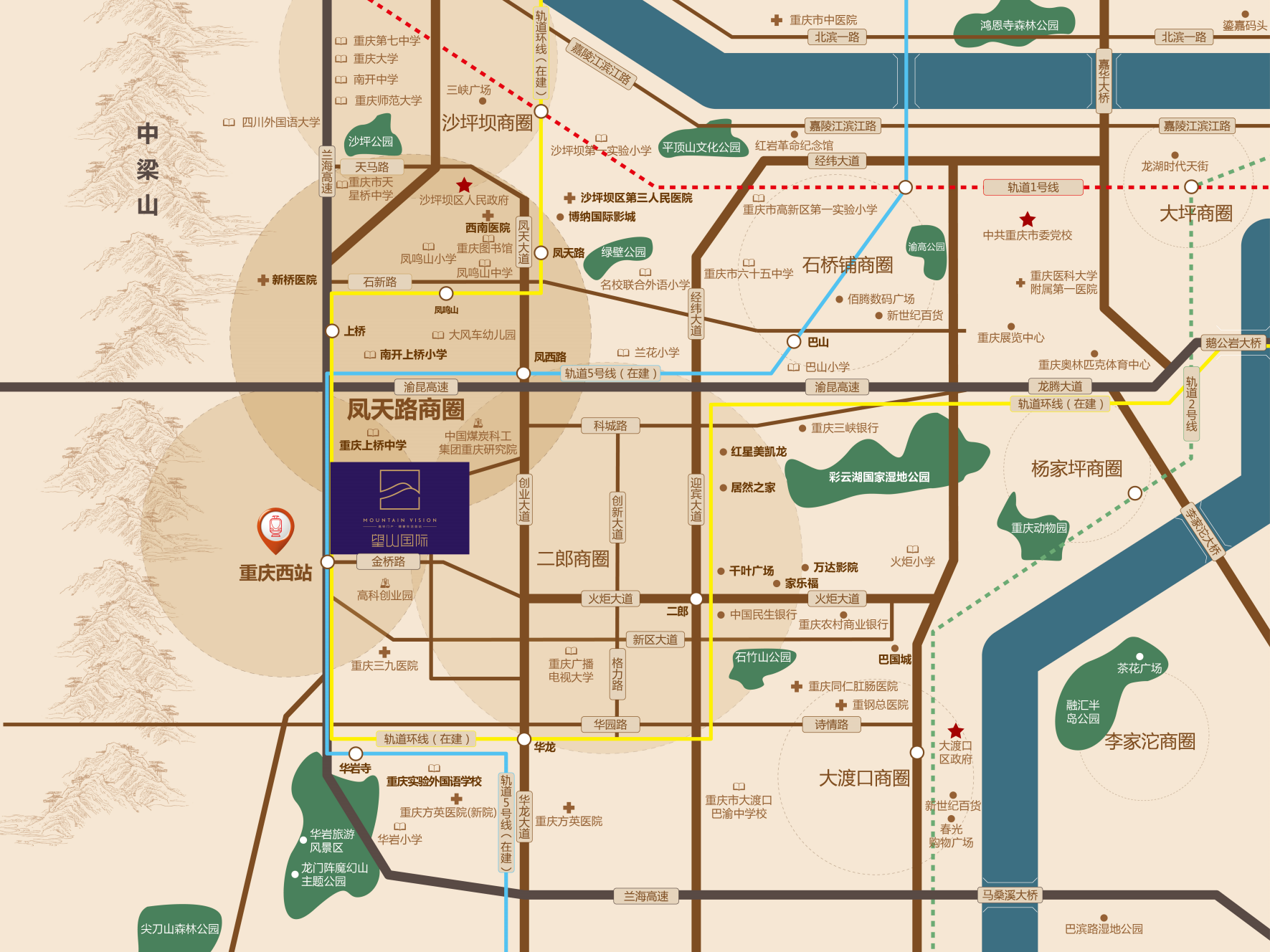 望山国际距离重庆西站仅约900米,位于轨道交通5号线(在建)、环线(在建)、12号线(规划中)节点位置,与站前经济圈(规划)、凤天商圈(规划)和二郎商圈形成无缝对接,三轨三商圈就在附近,将引发业主生活、工作、消费模式的巨大变革。
