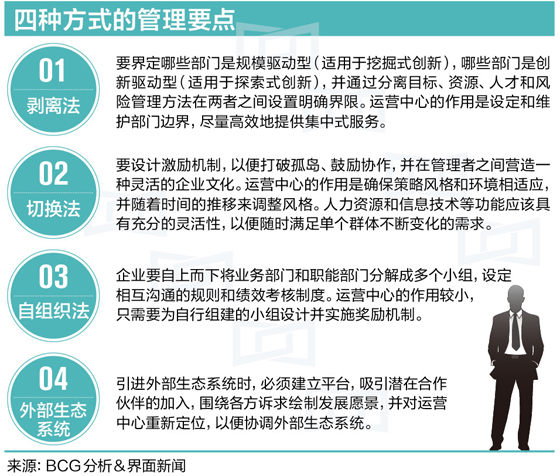 波士顿咨询统计表明,在参与调查的130名上市公司和私营企业高管中,90%完全赞同采取多种策略风格和过渡方式,并认为对于企业来说,这是一项亟待开发的重要能力。但这个愿望实现起来难度也很大,因为不同的创新方式也往往意味着截然不同的组织和管理模式,有时它们很难共存。