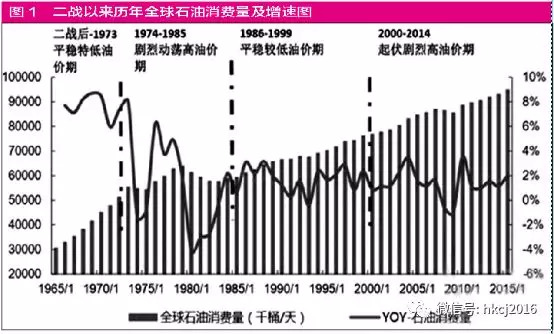下图(见图1)是二战以来原油消费增速图,消费基本稳定,最近25年年均增速仅仅2%!从供需关系来说,原油价格太高,产油国一旦加大产能投资,很快就会出现供大于求的局面,油价自然会回落。很简单,未来原油价格不取决于需求的增长,而是取决于供应量的遏制。