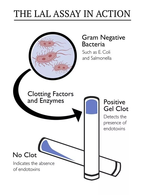 其实,上文提到的救命药主要都在这种蓝色血液里了。在鲎血液的循环阿米巴样细胞中,有一种裂解物叫作鲎阿米巴样细胞裂解物( Limulus Amebocyte Lysate,下文简写为LAL ),它可以被用于检测革兰氏阴性细菌细胞壁的成分脂多糖(内毒素)。
