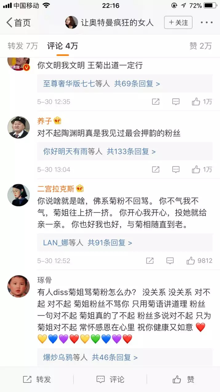 昨天一条的黑王菊的微博,因为粉丝整齐的队形回复,搞笑自黑的态度,整整被转发了七万条,陶渊明也被路人笑称为“饭圈粉丝的模范”。甚至有人直接表示,比起来王菊本人,王菊的粉丝更讨人喜欢。