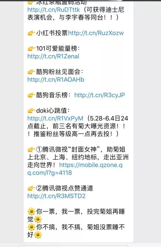数据组时常在群里进行滚动的发布为王菊投票的链接汇总,并教给新来的成员如何投票,监视流量曲线,定期督促大家的投票情况等。