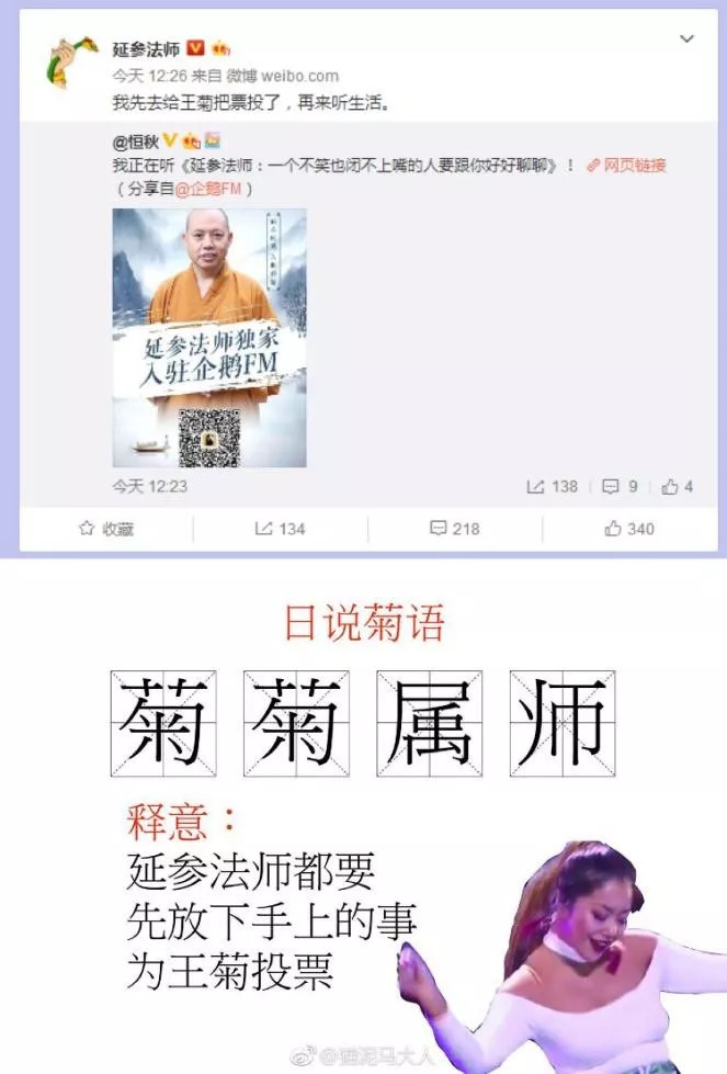 表情包组是吸引路人兴趣的主力军,按照各个兴趣维度制作不同的方向,比如吃鸡表情包,王者荣耀表情包,灭霸表情包……还有每当有明星出来支持王菊时,菊家军会立刻用模板创造出一个与菊相关的新成语并配上解释,比如昨天的延参法师,就创造出了菊菊属师这个词。