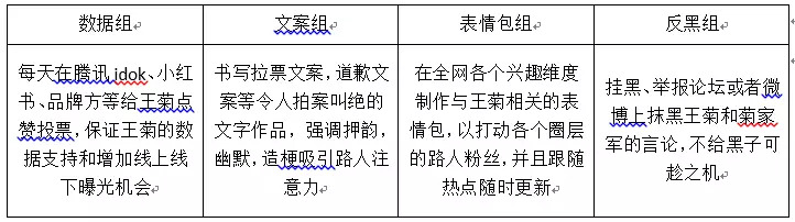 从明星营销的角度来讲,这四项其实已经承包了人设包装,宣传推广,粉丝运营,公关维护的四个环节。并且因为会玩梗的缘故,粉丝自然为王菊吸引了许多路人好感,可以说王菊的爆红与粉丝的推动是一种强关联的关系。