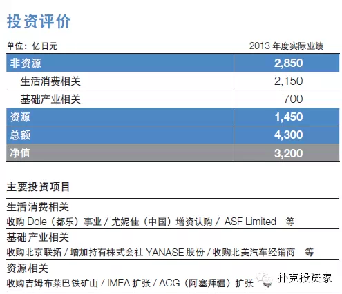 伊藤忠拥有中国最大食品和流通企业顶新国际集团的20%股权,双方在方便面原料供给等方面展开合作。而此次参与合作的正大集团旗下则拥有在中国运营的饲料公司,两家公司的业务领域很少重合。在资源价格前景的不确定性日趋加强的背景下,伊藤忠正积极进入粮食和纺织等非资源领域。在其2013财年(截至2014年3月)的2453亿日元合并净利润中,非资源领域所占的比重达到了80%,在日本所有商社中这一比例明显较高。伊藤忠曾在以2014财年为最终年度的中期经营计划中提出要在2年里投资约1万亿日元。目前正在积极投资于非资源领域,除了已从美国都乐食品公司(Dole Food Company)收购食品加工和亚洲蔬菜水果业务之外,还将收购日本国内最大牛仔裤生产商DENIM等。