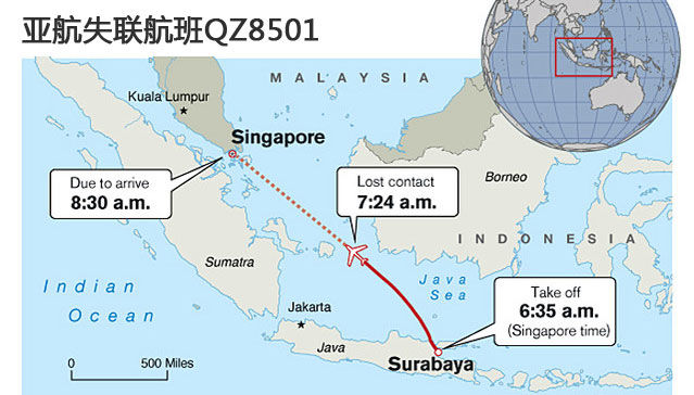 失联飞机为马来西亚亚洲航空公司(AirAsia Malaysia,下称亚航)旗下印尼亚航(AirAsia Indonesia)QZ8501航班。该航班于当地时间28日5时35分(北京时间6时35分)从泗水朱安达国际机场起飞,目的地是新加坡。