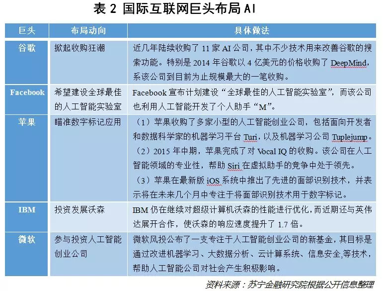 不单单是国内。国际上,以谷歌、Facebook、苹果、IBM等公司为代表的互联网巨头也在大力布局AI(参见表2)。