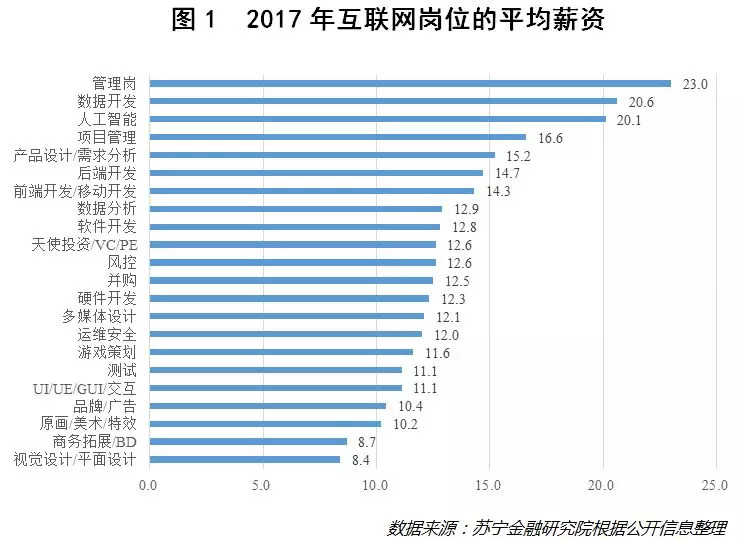 数据显示,2017年的互联网行业中,人工智能的岗位薪酬位列三甲,平均月薪在20k以上(参见图1)。此外,和传统技术岗位相比,人工智能领域给不同经验阶段的求职者提供了相对优厚的薪酬。互联网招聘平台拉勾网的数据显示,一个应届生从事AI行业,月薪可以达到9k,但做移动开发仅能拿到6k;拥有10 年以上工作经验的优质人才,从事AI的薪酬能比后端开发翻了近一番。