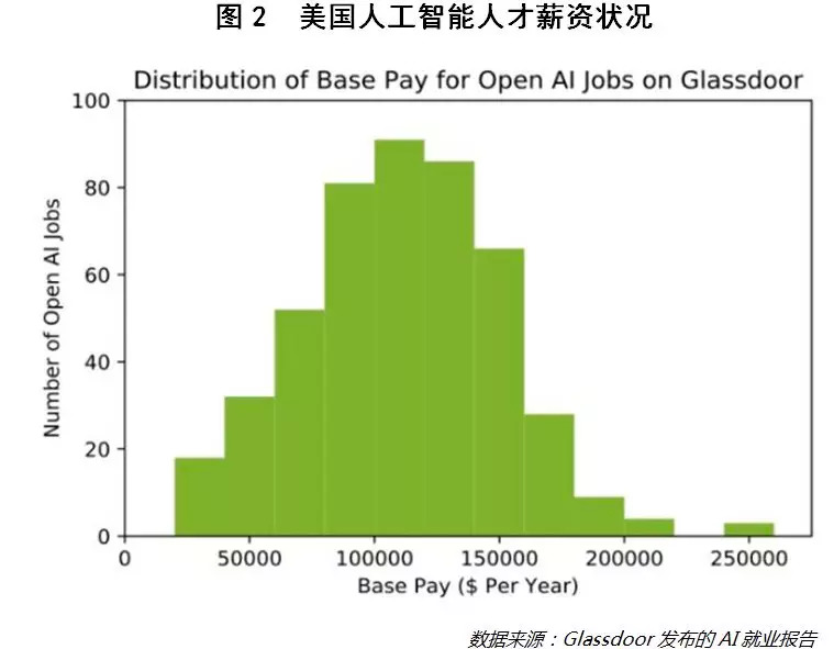 国内尚且如此,国外又是怎样呢?美国就业网站 Glassdoor于2017年11月发布的AI就业报告显示,AI各个相关职位的平均基础年薪都在11万美元以上。研究发现,AI 相关工作的年薪呈钟形分布,大多数职位年薪10万~20万美元,薪酬最高的 AI 职位基本薪酬为每年24万~26万美元(参见图2)。即使不考虑公司对于人才的奖金及股权激励,这个数字也足以跻身当今美国收入最高的职位之列。