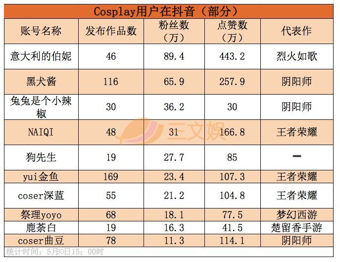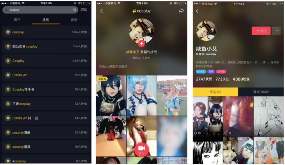 17 岁的@咸鱼小艾是一个 cosplay 爱好者,她在抖音发布的 62 条短视频吸引了 4390 个粉丝,不是“大 V”,但发起的#cospaly 挑战,参与数达到了 1.9 万。