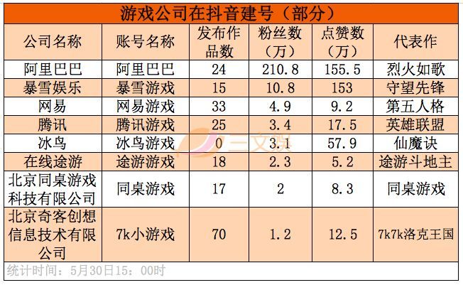 暴雪,腾讯,网易,阿里巴巴,在线途游等公司,都在抖音开设了官方账号。从粉丝数来看,阿里巴巴超过 200 万,是统计游戏公司中粉丝最多的一家公司。共发布 24 个作品,侧重企业品牌宣传,无游戏产品相关内容。阿里巴巴员工跳海草舞的单条视频,获得 11.2 万的点赞;马云祝福 102 对新人的单条视频点赞数,为 3.3 万。