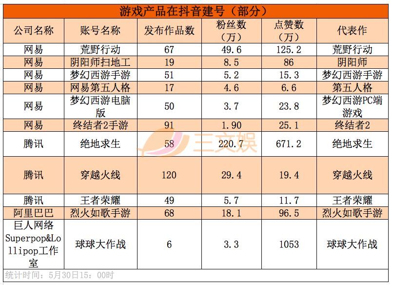 和游戏公司的抖音号相比,游戏账号的粉丝数和点赞数有了巨大的飞跃。统计中,粉丝数超过 20 万的游戏账号,有@穿越火线,@荒野行动,@绝地求生。网易阴阳师官方账号@阴阳师扫地工,粉丝数也达到 8.5 万。