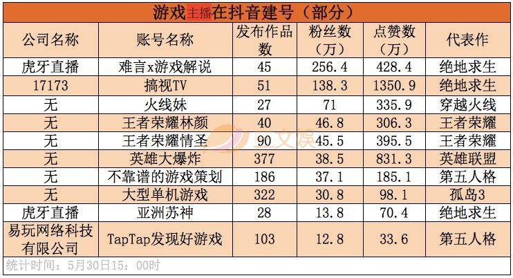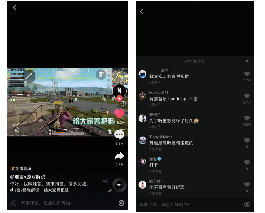 @难言X游戏解说是虎牙直播签约主播,也是知名游戏博主,微博粉丝 18 万,但抖音粉丝已达到 256.4 万。他单条点赞最高的短视频,是入驻抖音的第一条,在《绝地求生:刺激战场》“给大家秀把狙”,用 M416 自动步枪、Kar98K 狙击枪在 15 秒内狙击玩家,每击杀一位玩家配声“抱歉”,吸引了 115.2 万玩家点赞。