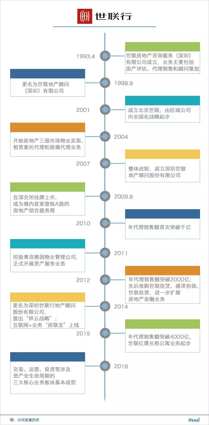 1993年,世联咨询在市场经济改革的前沿深圳成立,从房产评估业务起家。伴随着房地产市场化尤其是房地产开发的快速发展,世联咨询逐步成长,更名为世联地产,业务扩展到新房代理销售和开发前期的顾问策划,并涉足存量物业租售经纪和按揭代理业务。
