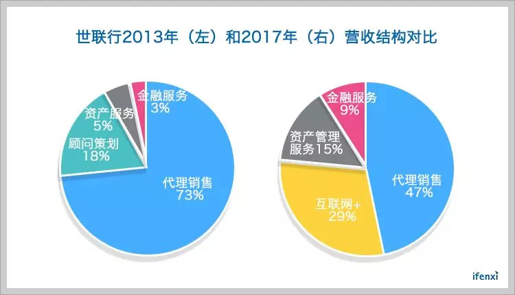 2013年到2017年,世联行的营收从近26亿元增长到82亿元,收入结构也产生了巨大变化,代理销售业务收入占比从73%下降到了47%,互联网+即电商交易业务收入占比大幅增加。