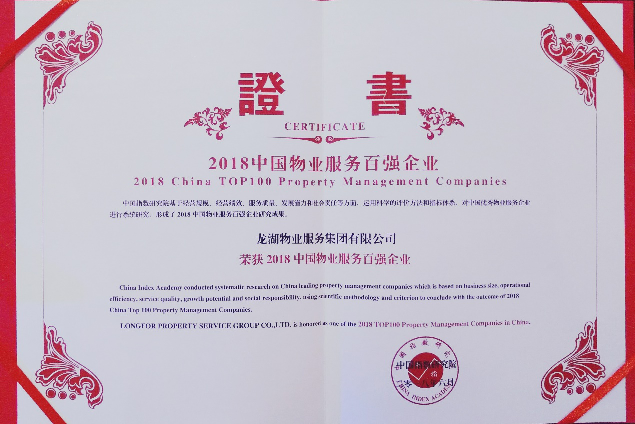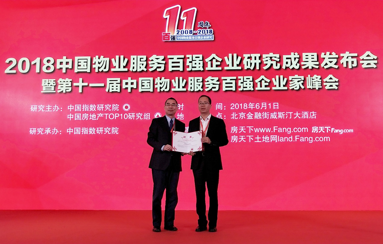 6月1日,2018中国物业服务百强企业研究成果在北京发布,龙湖物业荣获中国物业服务百强企业综合实力第九位,并荣获2018中国物业服务百强企业经营绩效第三名及科技物业领先企业殊荣。