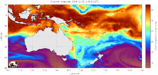 下面这幅大气水汽总含量的图,显示了过去几天印尼附近(左上角)大面积的湿润水汽。