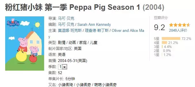 动画片《小猪佩奇》每集约5分钟,讲述了一个短小幽默的故事。情节生动并赋予教育意义,深受世界各地小朋友及家长的喜爱,目前豆瓣评分达9.2高分。