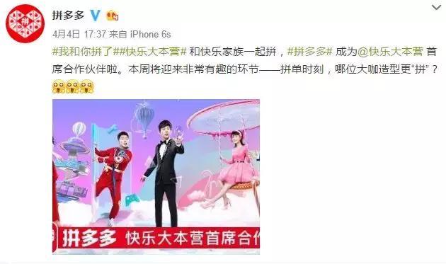 拼多多就是这样一个例子。从独家冠名东方卫视《欢乐喜剧人4》,特约赞助《极限挑战3》,独家冠名江苏卫视的《非诚勿扰》,浙江卫视的《中国新歌声2》《奔跑吧2》,到近日成为湖南卫视《快乐大本营》首席合作伙伴,独家冠名《我是大侦探》等,它如病毒般席卷了各大综艺节目,洗脑广告歌曲更是唱遍街头巷尾。不少观众抗议:“请拼多多放过《快乐大本营》。”