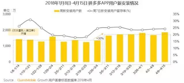 在娱乐营销上砸了好几亿元的拼多多,以“霸屏”王牌综艺节目的方式疯狂营销,获得了较大的认知度。QuestMobile报告显示,《欢乐喜剧人4》播出期间,拼多多新安装用户数平均增长30%以上。