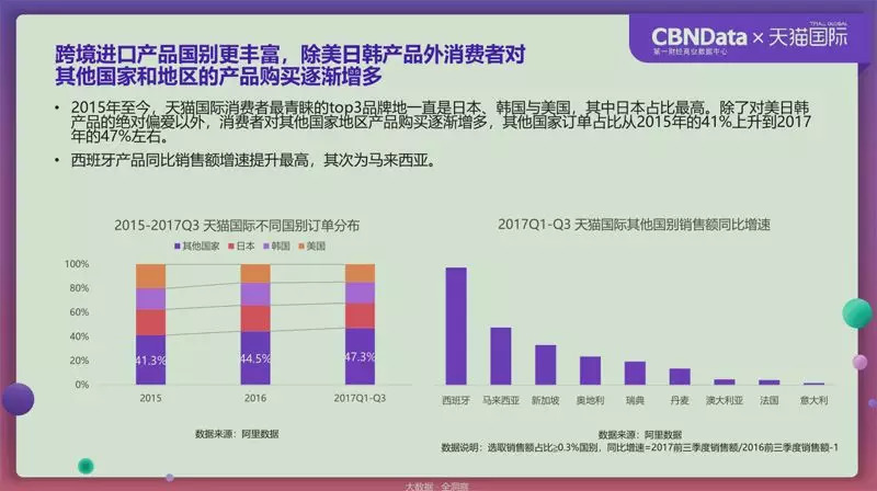 去年底,第一财经商业数据中心联合天猫国际发布的《天猫国际跨境消费洞察报告——线上90、95后消费人群浅析》也显示,在传统的美、日、韩外,2017年前三季度,消费者通过天猫国际购买的来自西班牙、马来西亚、新加坡、奥地利等新兴国家的化妆品增速明显上升。