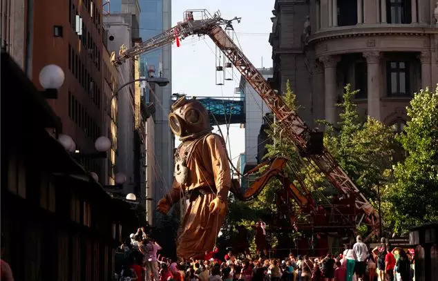 只见一座三层楼高的机械巨人步伐轻盈地行走在大道上。人行道挤满了欢呼雀跃的人们。