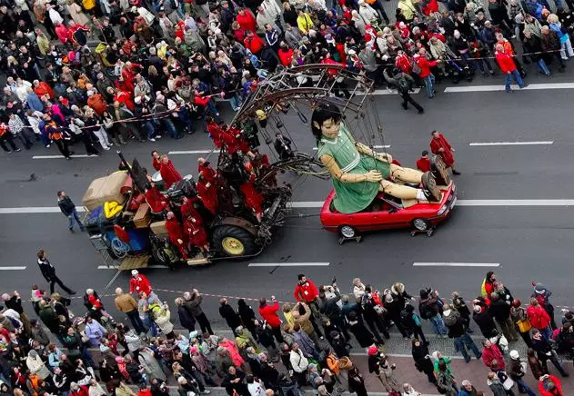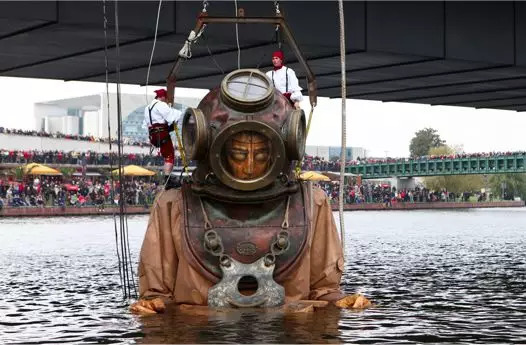 巨人的牵引者是一群身穿红色天鹅绒的古典宫廷装的杂技演员们,他们身体的一举一动牵动着巨人木偶的运动。