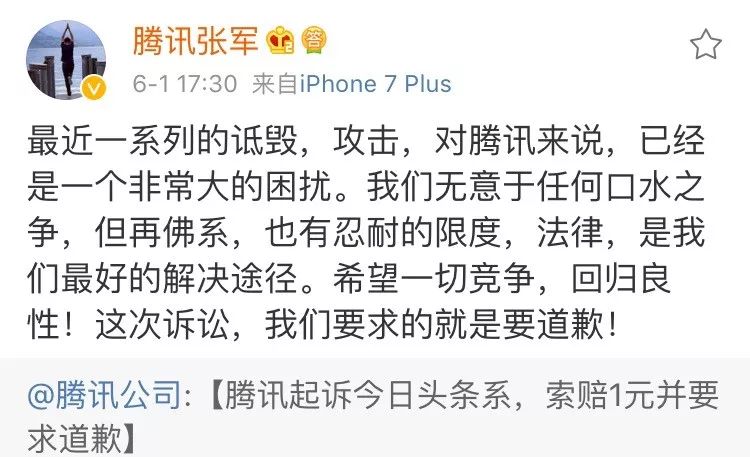 6月1日17:30,腾讯公关总监张军也发微博称:最近一系列的诋毁,攻击,对腾讯来说,已经是一个非常大的困扰。我们无意于任何口水之争,但再佛系,也有忍耐的限度,法律,是我们最好的解决途径。希望一切竞争,回归良性!这次诉讼,我们要求的就是要道歉!