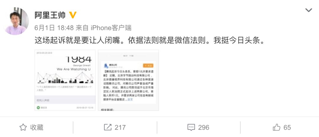 6月1日18:48,阿里集团市场公关委员会主席王帅发微博称:这场起诉就是要让人闭嘴。依据法则就是微信法则。我挺今日头条。