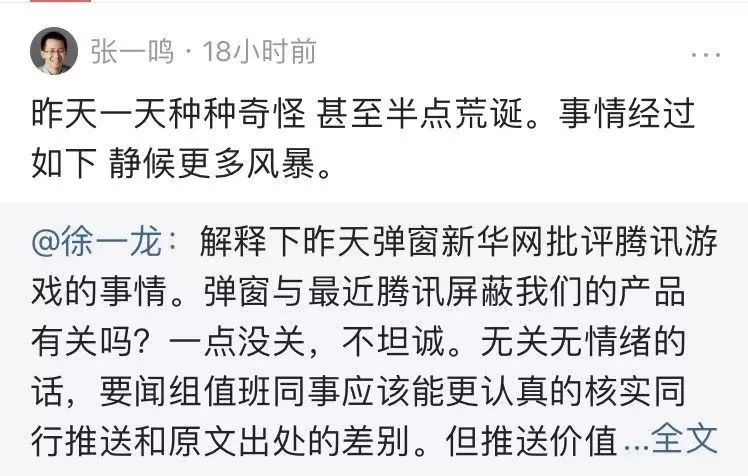 张一鸣所说的事情经过,就是5月30日今日头条弹窗新华网批评腾讯游戏的事情。今日头条副总编徐一龙对此进行了解释。